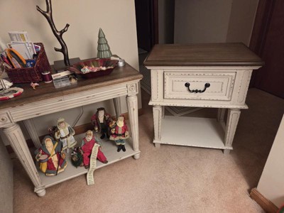 Elevating the art of traditional cottage styling, this nightstand is your dream bedroom retreat realized. Antiqued two-tone aesthetic blends a chipped white with a distressed wood finished top for added charm. Adorned with classic bail pull hardware, the smooth-gliding drawer is crafted with quality dovetail construction for years of satisfaction. Signature Design by Ashley is a registered trademark of Ashley Furniture Industries, Inc.