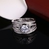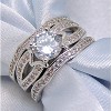 The Rebecca Bridal Set from the esteemed Ginger Lyne Collection is an embodiment of love, commitment, and unparalleled craftsmanship. Designed with attention to detail and a keen sense of style, this set showcases the enduring promise of two souls intertwined. At its heart, a stunning solitaire engagement ring shines brilliantly with a 6.5mm round cut center stone. This solitaire masterpiece is gracefully accented with sparkling AAA quality Cubic Zirconia, reflecting a symphony of light and elegance. Accompanying the solitaire are two stackable wedding bands, crafted to perfection to sit flush against the engagement ring. Together, they create a harmonious ensemble, reminiscent of the beautiful journey of love, growth, and togetherness. Every stone is meticulously set, ensuring it captures and refracts light, illuminating the hand that wears it. The rings are plated in lustrous white gold over a robust copper base. As with any Fashion Jewelry made of a alloy base and plated it is not recommended for extended daily wear. To keep its beauty longer wear on occasion and protect from water and chemicals. Gift-giving is made memorable with the Rebecca Bridal Set. Whether it's a proposal, an anniversary, a birthday, or any special occasion, this set promises to be the centerpiece of cherished memories. It's more than just jewelry; it's a symbol of love, a testament to commitment, and a reflection of the bond shared. The Ginger Lyne Collection, a proud US-owned corporation, stands as a beacon of authenticity, innovation, and craftsmanship. The Rebecca Bridal Set, bearing the collection's registered trademark, is a testament to its unwavering commitment to quality and design. Dive into the world of Ginger Lyne for more exquisite jewelry pieces, and let every piece tell a story of love, elegance, and timeless beauty.