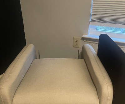 Saw this chair in store in the white, me and my husband liked it because how comfortable it was (the seat sinks in)later i decided to go online and check out the colors so we bought the grey. I was surprised the reviews were terrible speaking trash about it because you buy what it is , so yes the chair is low to the ground and yes its smaller and thinner perfect for a smaller living situation which is why it was perfect for us, and the back rest was confusing BUT READ THE INSTRUCTIONS the black peice that comes in the box gets a cover witch is in a little box tucked in just look and read with your eyes, so do i recommend this chair HECK YES its perfect its tiny but comfy it turns all the way around rocks reclines AND massages your butt, it just vibrates but i didnt know it did that but i recommend this chair when your in need of one for your room or smaller nursery or shared which was my situation and low to the ground to get up easy for us shorter people, so yes exspect a small but comfy chair 10/10