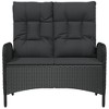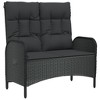 - This reclining outdoor garden bench is designed to enhance your outdoor spaces, combining comfort and function with its sleek, modern look. Built with a strong powder-coated steel frame and smart poly rattan weaving, it¡¯s perfect for a bit of relaxation in balconies, patios, or gardens. Durability: Made from UV and water-resistant materials, this bench stands up to the weather, keeping it in good shape without much fuss. Comfort: The bench has thick, removable cushions made from 100% polyester for easy cleaning, giving you a comfy seat. Versatility: Perfect for different settings, including dining and lounging, fitting two people comfortably. Adjustability: The manual multi-position backrest lets you find your preferred angle for the ultimate chill. Dimensions: With a generous width of 39.4 in, depth of 18.5 in, and height of 42.9 in, it looks great in any outdoor spot. Color: Black Shape: RectangularMaterial: Synthetic Poly RattanFinish: Powder-Coated Indoor/Outdoor: Outdoor OnlyCover Included: NoRoom: Garden and terraceCapacity: 2Maximum Number of People: 2Dimensions: 24.6 x 42.1 x 42.9 in (W x L x H)Leg Height: 16.9 inWeight: 33.07 lbsSeat Depth: 18.5 inSeating Capacity: 2Swings: NoDelivery Contains: 1 x Garden bench, 2 x Back cushion, 2 x Seat cushionAssembly Required: YesRecommended Number of People for Assembly: 1