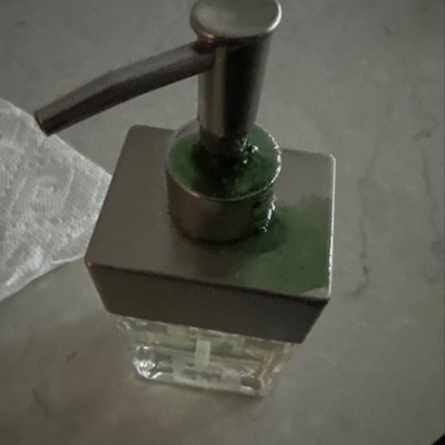 - Glass soap dispenser with metallic finish top adds contemporary flair to your space