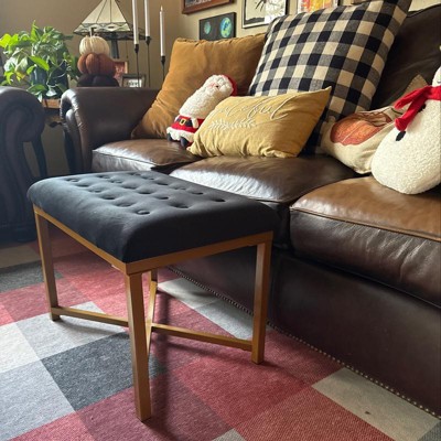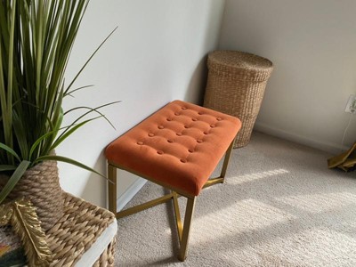 Embrace modern luxury with this metal bench velvet seat. This soft tufted velvet ottoman over a metal base performs multiple functions in any home. Use this velvet ottoman to prop up feet in a family room, to display favorite books in a living room, or to seat an extra guest in the dining room. Multiply the impact by pairing two together at the end of a bed or in front of a favorite place to lounge. Available in a variety of colors, this metal bench is easy to assemble and maintain. Please note that fabric and wood colors may appear slightly different due to variations in lighting or screen settings.