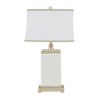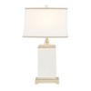 Bring a touch of elegance to any room in your home with the Colette Ceramic Table Lamp. This rectangular table lamp features an ivory ceramic stand with an antique silver metal base and top to create a sophisticated transitional look. The off-white cotton shade softly filters the light into your room and is accented with a grey trim to complement the design. No assembly required. PRODUCT DETAILS See below 1 Table Lamp: 17"W x 11"D x 29.5"H Shade Size: Top(16"W x 10"D) x Bottom(17"W x 11"D) x 11"H Body Size: 9"W x 9"D x 21.375"H Socket Size: 1.5"Dia x 2.5"H Cord Length: 72" MATERIAL 45% Ceramic, 35% Iron, 30% Fabric Base: 60% ceramic, 40% iron Base Metal Finish: Antique silver Shade Fabrication: Off-white cotton with grey trim
