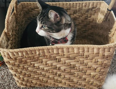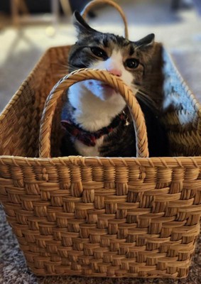 This is a nice large wicker woven basket with handles. It is a lightweight easy to use basket. My cat Jax automatically claimed this basket. I put a blanket in the bottom of it and he lays right in it!