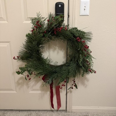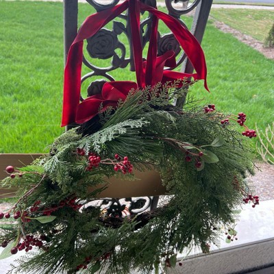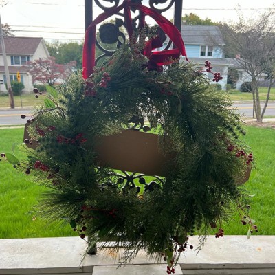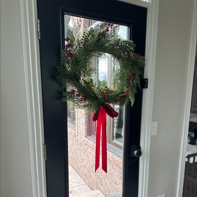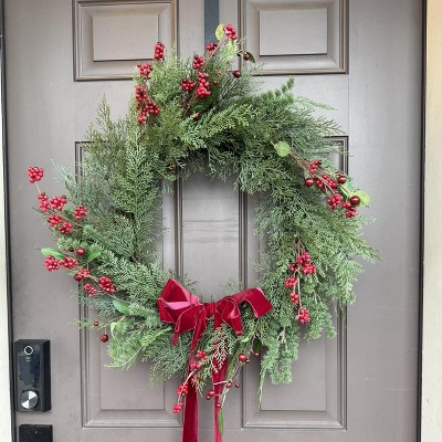 [This review was collected as part of a promotion.] This is a very beautiful Christmas wreath for the holiday season. I absolutely loved the greenery with the red cranberry accents inside the wreath. The bright red bow really looks beautiful against the wreath. I hung this on my porch and got so many compliments. The greenery looks quite real, even though it is fake. This is a large wreath so if you have a big door this would be the perfect wreath for you