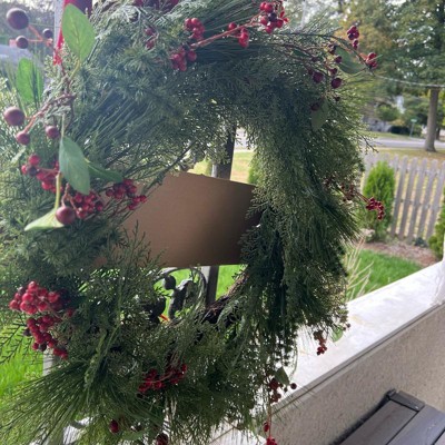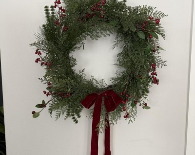 Spread festive vibes throughout your home with this Holiday Wreath from Threshold™ designed with Studio McGee. This circular holiday wreath showcases faux cypress leaves and pine needles in a green hue plus red berries and a red bow for an elegant, natural look. Featuring a back loop, you can hang this holiday wreath on windows or above the mantel to add a wintry touch to your decor.