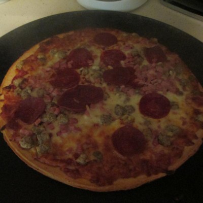 [This review was collected as part of a promotion.] This oven crust pizza is the meat trio and I didnt like much the combination of meats with the pepperoni but the crust and cheese tasted delicious. My kids liked it but didnt make it one of there favorites pizza.