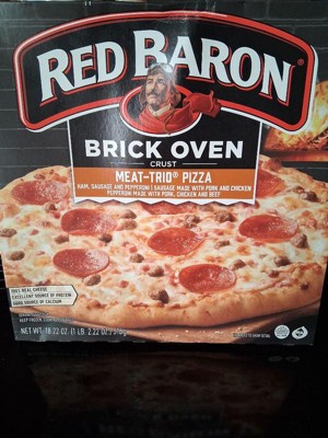 - RED BARON Brick Oven MEAT-TRIO Pizza is made with zesty tomato sauce, 100% real cheese, and hearty toppings of ham, sausage and pepperoni