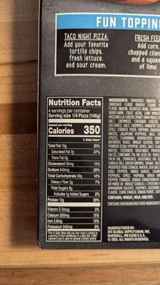 tomatoes (water, tomato paste), enriched flour (wheat flour, malted barley flour, niacin, reduced iron, thiamine mononitrate, riboflavin, folic acid), low moisture part skim mozzarella cheese (part skim milk, cheese cultures, salt, enzymes), cheddar cheese (milk, cheese cultures, salt, enzymes, annatto [color]), mexican style cooked pizza topping (sausage [pork, beef, water, jalapeno peppers, salt, tomato powder, spices, flavoring, hydrolyzed corn, torula and brewers yeast, wheat gluten, soy protein, chili powder (chili pepper, spice, salt, flavoring), sugar], water, textured vegetable protein [soy flour, salt]), contains 2% or less of: yeast, green chilies, palm oil, tomatoes, vegetable oil (soybean and/or canola oil), green onions, sugar, salt, bell peppers, modified food starch, water, sea salt, maltodextrin, chili pepper, dried garlic, cilantro, jalapeno peppers, spice, paprika, dried onion, jalapeno pepper powder, dough conditioners (contains one or more of: wheat starch, l-cysteine hydrochloride, ammonium sulfate, enzymes, ascorbic acid), natural flavor, corn starch, onion puree, soy lecithin.' '