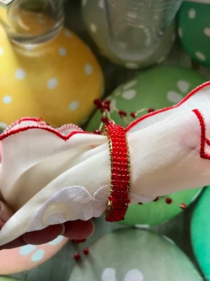 [This review was collected as part of a promotion.] The set of 4 Beaded Design Napkin Rings are adorable. I used them for a small dinner I had and they looked very festive and the perfect pop of color that was needed against the white napkins. I would get more!