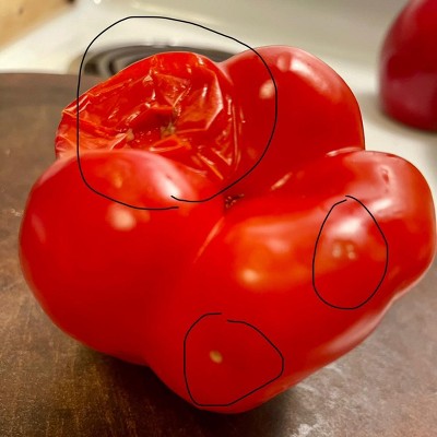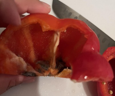 2 rotten spots in the pepper. surely a better one could have been chosen by the worker.