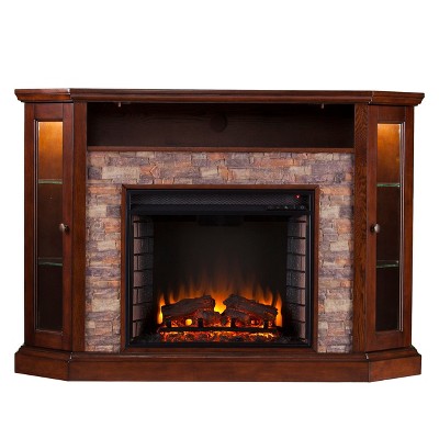 Sold as a set of multiple boxes. Turn up the coziness with this electric fireplace. The elegant espresso finish and stacked faux stone effortlessly add character and style to your space, while LED-lit cabinets showcase your favorite treasures and framed memories. An adjustable back panel lets this curio fireplace fit snugly into a corner or against a flat wall for maximum versatility. Switch on the heat during chilly winters for that cozy haven feel, and when the weather warms up, keep the inviting atmosphere going without the heat. Whether you're sprucing up your apartment living room or giving your home office a welcoming feel, this electric fireplace with mantel adds a touch of sophistication to any space.