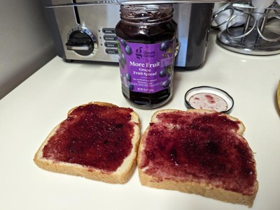 Good & Gather More Fruit Reduced Sugar Grape Fruit Spread is delicious! It tastes amazing! The grape flavor is one of the best I have ever tasted. I love that it has no artificial sweeteners but has 40 percent less sugar than regular grape jelly. You do not notice that it has less sugar. I think with the less sugar it has much more flavor than regular jelly. It spreads really easily and was not lumpy. The jar has 15.5 ounces. Regular jelly has 10 grams of sugar per serving and this fruit spread has 6 grams of sugar per serving. I made my husband a peanut butter and jelly sandwich with it and he loved the flavor. He really liked the taste and did not notice that it has less sugar than regular jelly. He wants me to buy this grape fruit spread all the time now. For families with kids, I definitely recommend this reduced sugar fruit spread. I wish I had this when my child was younger when you do not want them to have too much sugar.