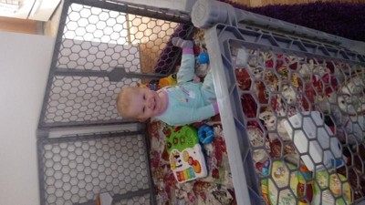 Made of high quality plastic, the 6-panel gate expands up to 192” wide and is designed with plastic hinged posts to offer a variety of shaping possibilities. It is deal for large and angled openings or as a play yard for your child.