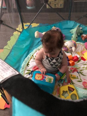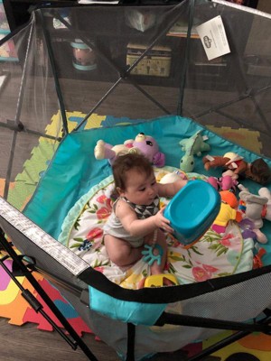 Easy to fold out and transfer to different places. No cushioning on floor though so I got a separate round play mat and my baby loves rolling around in it!!