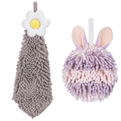 REGALWOVEN 2 Packs Chenille Hand Towel Flower and Cute Cartoon Hanging Hand Towel for Bathroom 6" x 15"/7" x 7" Grey/Purple