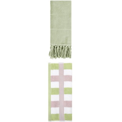REGALWOVEN 2 Packs Cotton Geometric and Solid Absorbent Soft Hand Towel for Bathroom Kitchen Green 14" x 30"/13" x 29"
