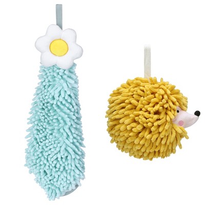 REGALWOVEN 2 Packs Cute Cartoon Alpaca Fuzzy Ball Hand Drying Hanging Ball Towels for Bathroom 7" x 7"/7" x 11" Green/Yellow