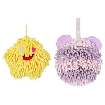 REGALWOVEN 2 Packs Fluffy Chenille Rabbit Shape Cute Soft Absorbent Hanging Ball Hand Towels 7" x 7" Yellow/Purple