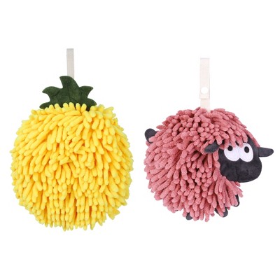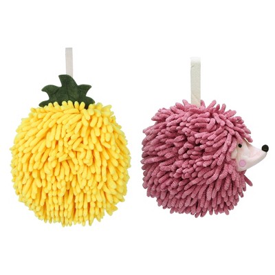 2 pcs hand towels, solid chenille ball hand towels: 1pcs, 6" x 6", 100% polyester; cute animal hand towels: 1pcs, 7" x 7", 90% polyester,10% nylon