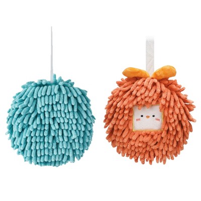 REGALWOVEN 2 Pcs Cute Comfortable Soft Absorbent Chenille Ball Fuzzy Hand Towel Blue/Orange 6" x 6"/7" x 7"