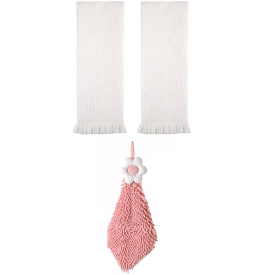 - 3 pcs hand towels, solid striped hand towels: 2pcs, 13" x 29", 100% cotton; chenille hand towels: 1pcs, 6" x 15", 90% polyester, 10% nylon