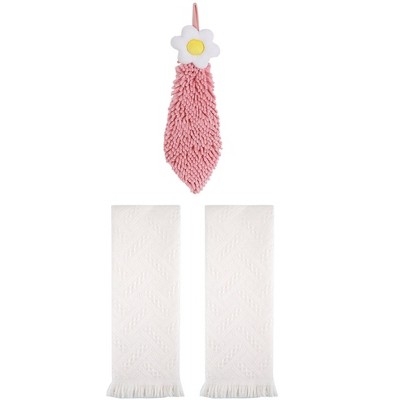 - 3 pcs hand towels, waffle cotton hand towels: 2pcs, 13" x 29", 100% cotton; chenille hand towels: 1pcs, 6" x 15", 90% polyester, 10% nylon