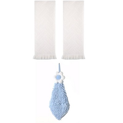 - 3 pcs hand towels, waffle cotton hand towels: 2pcs, 13" x 29", 100% cotton; chenille hand towels: 1pcs, 6" x 15", 90% polyester, 10% nylon