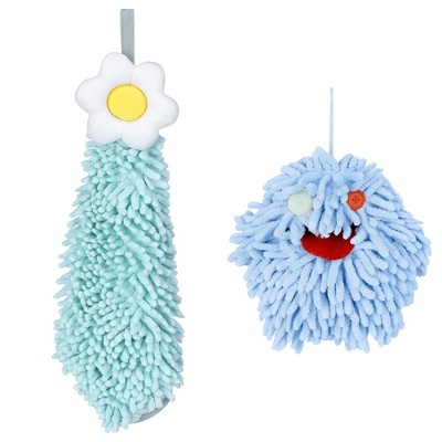 REGALWOVEN Absorbent Soft Chenille Cartoon Alpaca Fuzzy Ball Bathroom Hanging Hand Towels 7" x 7"/7" x 11" 2 Pcs Green/Blue