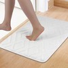This bath mat is designed to instantly soak up moisture from the soles of your feet, allowing you to bid farewell to the trouble of slippery floors. The anti-slip design on the back ensures it adheres tightly to the ground, preventing any shifting or skidding. Its versatility allows it to complement any bathroom style, whether modern-minimalist or Euro luxury, adding a touch of warmth and elegance. The plush polyester material provides a cozy haven for your feet, while the medium pile height offers comfort and softness. It's machine washable, making maintenance a breeze, and the robust PVC backing ensures durability. Perfect for use in various rooms such as bathrooms, kitchens, living rooms, and even outdoor spaces, this bath mat is a practical and stylish addition to any home. Enjoy a dry, comfortable bathing experience with this essential home accessory.