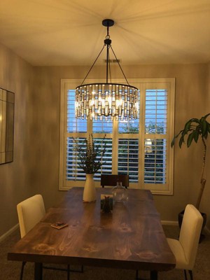 So beautiful! Love how it reflects the light! We added a dimmer switch and are very happy with how the chandelier looks in all settings. It is more of a very dark brown than bronze. The width looks great with my 42” wide dining table! Highly recommend!
