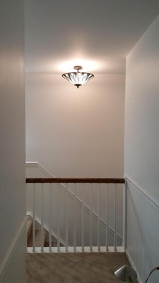 Beautiful and well made light. Looks perfect at the top of the upstairs steps. Two 40W soft light bulbs are perfect.
