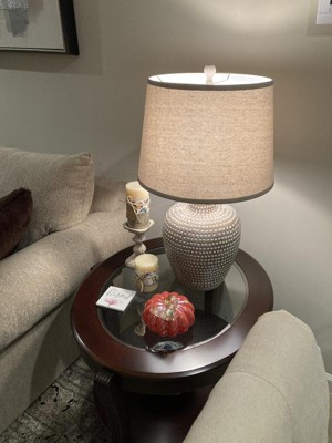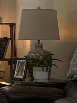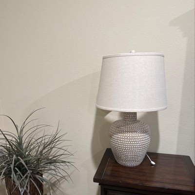 Love these lamps that I needed for our newly purchased condo. They are just as described, arrived quickly without any damage, due to the well packed boxes. The pot style lamps are being used on end tables in our living room area. They are a perfect match for the decor of the off whites, creams, beiges, the seadrift color of the entertainment center, and the natural color of the woven seagrass cord of side & coffee tables. They are sturdy, a size that does not overwhelm the room, and the light beige shades are a proper fit & size for the ceramic pot bases. I highly recommend this pair of attractive lamps which were well priced. Very pleased with this purchase.