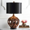 Illuminate your space with the regina table lamp, a striking blend of artistry and functionality. Featuring a copper hole finish and a sleek black satin shade, this lamp brings modern elegance to any room. The base is crafted from gold glazed ceramic, adding a touch of sophistication and warmth. The intriguing design captures attention and complements a variety of interior styles, making it a versatile addition to your decor. Whether placed on a bedside table or in a living area, the regina table lamp creates an inviting atmosphere, enhancing your home's aesthetic with its radiant glow.