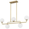 With a brushed gold finish and glass globes, the Regis island light makes a striking statement. The linear, geometric frame features opal etched swirled glass globes, facing both upwards and downwards for an intriguing lighting effect. Hang the Regis chandelier over any modern kitchen island, bar area, or dining room table for instant style.