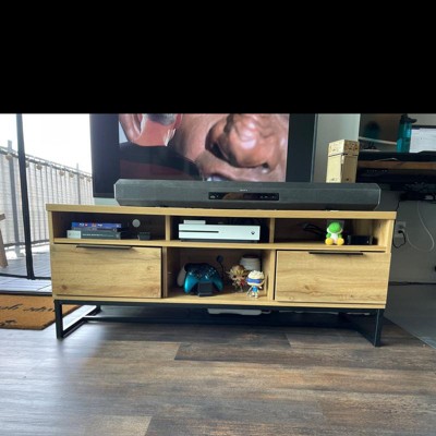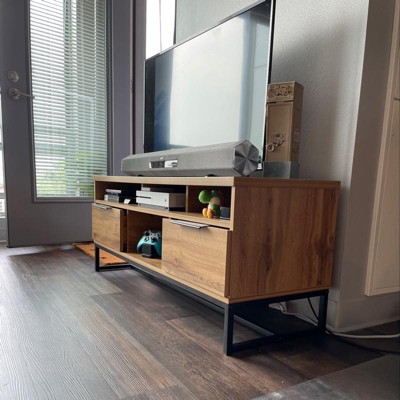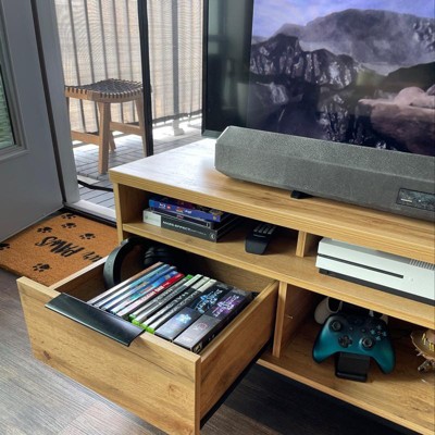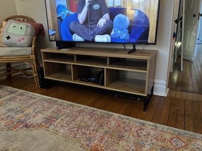 With its clean lines and natural wood tones, the Reid TV stand is a stylish addition to any space. This wood TV stand pairs a natural oak finish with black metal for a cool, contemporary look. Five shelves, fitted with cord management holes, provide space to store entertainment consoles. Two spacious drawers provide storage for manuals, controllers, and more. Long black metal drawer handles add a chic, minimalist touch. The Reid TV stand is made in Malaysia and requires assembly. Dimensions: 19.29" high x 47.24" wide x 15.75" deep; Drawer dimensions: 13.58" high x 14.41" wide x 7.09" deep; Upper shelf: 15" high x 14.41" wide x 3.58" deep; Lower shelf: 15" high x 14.41" wide x 3.39" deep; Legs: 5.91" high;