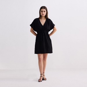 This classic, breezy LBD is your perfect party pick! The side pockets, gathered waist with a drawstring, flared sleeves, deep V-neck, and short length beautifully blend style and functionality with timeless fashion. Made from luxurious Bemberg™ Crepe, this dress features a relaxed fit and side slits for added comfort and movement. You can style it in countless ways and grace every look with effortless ease. Super flattering and stylish, it’s a timeless yet modern piece for all your fancy events.