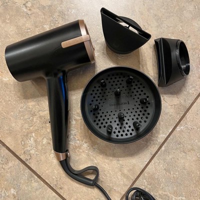 [This review was collected as part of a promotion.] This hairdryer is super lightweight and has a real pretty matte finish. It comes with attachments to keep flyways away, and also a diffuser to get your hair nice and curly.