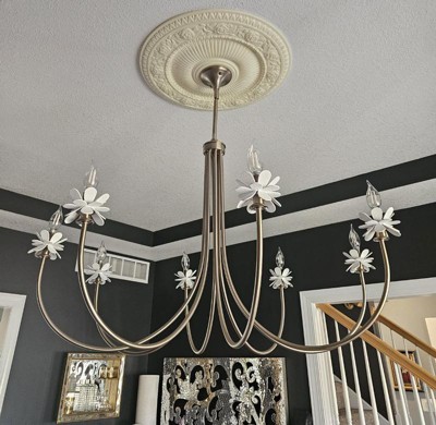 [This review was collected as part of a promotion.] This is an absolutely stunning and eye-catching chandelier. It has a very feminine look to it, with the dainty white floral accents. It will look good in a bedroom (especially for a little girl), an entry way, a dining area, or anywhere you want to make a statement in your home. The bronze gold color is so timeless while also being popular and chic at this day and time. The box and packaging it comes in is HUGE and there are a ton of little boxes, so setup is a little overwhelming. Keep that in mind. But if you want an absolutely beautiful chandelier for your space; you cannot go wrong with the Remy by Quoizel.