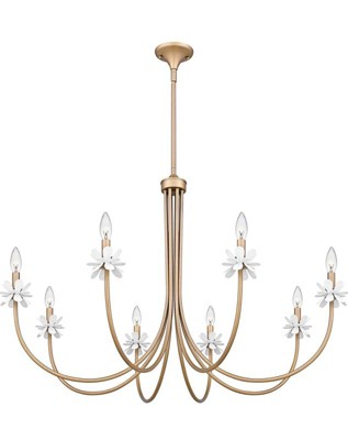[This review was collected as part of a promotion.] This is an absolutely stunning and eye-catching chandelier. It has a very feminine look to it, with the dainty white floral accents. It will look good in a bedroom (especially for a little girl), an entry way, a dining area, or anywhere you want to make a statement in your home. The bronze gold color is so timeless while also being popular and chic at this day and time. The box and packaging it comes in is HUGE and there are a ton of little boxes, so setup is a little overwhelming. Keep that in mind. But if you want an absolutely beautiful chandelier for your space; you cannot go wrong with the Remy by Quoizel.