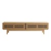 Tap into mid-century aesthetics with the Render 71" TV Stand. This installment of the Render collection features a durable particleboard frame with smooth walnut grain laminate, four tapered wood legs, an adjustable shelf on both sides, two cable management holes, side vertical storage areas, and two bottom-hinged doors for easy access to shelf storage. This versatile mid-century modern living room table features a solid construction with a pleasing look and practical functionality. Perfect for media storage, Render accommodates flat-screen TVs up to 78” wide.