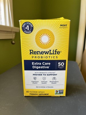 Renew Life Extra Care Probiotic offers 12 probiotic strains in easy-to-swallow capsules to promote immune, respiratory and digestive health (1). Featuring more clinically studied strains than the leading brand (2), these men's and women's probiotic pills contain a blend of 12 different probiotic strains including L. rhamnosus GG, the No. 1 most studied strain (3). With 50 billion cultures, these Renew Life probiotic capsules make it easy to support digestive, respiratory and immune health. Each strain is clinically tested and formulated by microbiologists and researchers to offer science-backed benefits. Renew Life puts health and wellness first with supplements that are backed by over 25 years of clinical trials.