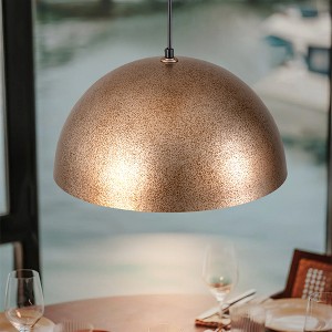 Enhance your space with this hammered dome pendant light, blending vintage and modern styles to present a refined handmade piece. Featuring a metal shade with a hammered texture, an antique dark silver exterior, and a gold leaf interior, this pendant light exudes captivating artistic charm. Available in 23", 19", and 15" sizes, this industrial pendant with an E26 socket (bulb not included) provides uniform downward lighting. Combining contemporary grace and rustic allure, this dome pendant elevates various settings.