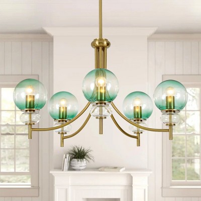 This 5-light gold chandelier blends modern glam with an artistic, nature-inspired silhouette. Its branching metal arms support a set of striking dual-tone glass globes¡ªeach combining gradient green and clear glass for a soft yet vibrant glow. The mix of smooth curves and polished gold tones adds depth and elegance, making it a standout piece in dining rooms, kitchens, or living areas. Adjustable downrods allow you to customize the hanging height, and the fixture is fully dimmable when paired with compatible bulbs and a dimmer switch (both not included).