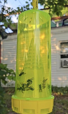This handy trap lures the offending insect in and it's not getting out! We had a yellow jacket nest in the back yard and no one was brave enough to try spraying it. I used this and they were all trapped - no stings happened! Only thing I would take a half star off for is it doesn't come with string to hang it.