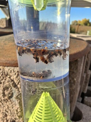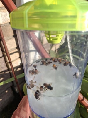 I bought one of these a couple of weeks ago. It has only been moderately successful. I've caught more with my modified pop bottle. Many wasps have escaped from the bottom cone. Fly around climb up the cone to the top go down the hole and escape out the bottom holes. There has to be a better design that will not allow them to go back down the inside of the cone.