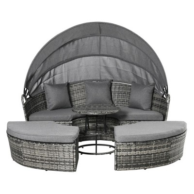 Experience ultimate relaxation with the Resenkos 4 Pieces Round Rattan Daybed Set, a perfect blend of comfort and style for your patio. This convertible patio furniture set includes a spacious daybed, two comfortable chairs, and an extending tea table Ottoman chair, making it ideal for both lounging and entertaining. The adjustable sun canopy provides shade and protection from the elements, ensuring a cozy retreat no matter the weather. Crafted with high-quality rattan, this sectional outdoor sofa boasts durability and a light gray finish that complements any outdoor setting. Enhance your seating experience with three plush pillows, designed to provide additional comfort and support. Transform your patio into a serene oasis with the Resenkos 4 Pieces Round Rattan Daybed Set, perfect for creating a relaxing outdoor living space.
