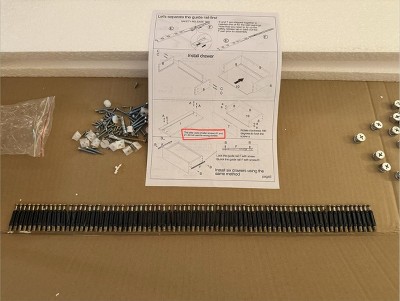 Considering these thing is already difficult to put together... i cant believe the instructions are wrong. Where it says to screw in the rails do not match up with the pre drilled holes. The rails should be flush with the edge of the board and the instructions do not indicate the correct holes to screw into to make te rails flush with the edge. If you buy this make sure to double check the instructions and pictures. They contradict each other. I had to go back and unscrew and redo 16 rails (an extra hour+). Very frustrating.