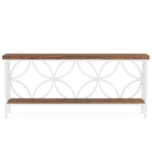 - 1. Vintage Design- The 2-Tier Console Table showcases a retro aesthetic with its vintage wood grain surface paired with black metal accents, making it an eye-catching addition to any room. This stylish 70.9" Industrial Sofa Table Behind Couch creates an enduring pastoral look that complements modern and traditional decor alike.