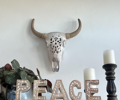 - A decoration for wall featuring a unique cow skull accent piece with detailed characteristics and an abstract cut-out pattern as well as a distressed whitewashed brown finish